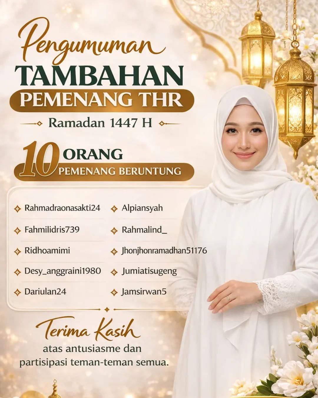 Terima kasih atas antusiasme luar biasa dari teman-teman semua dalam mengikuti kegiatan berbagi THR Ramadan tahun ini. Sebagai bentuk apresiasi, kami menambahkan 10 orang pemenang beruntung, yang masing-masing akan mendapatkan THR sebesar Rp100.000 per orang.” Tulis Dr Maharani.
