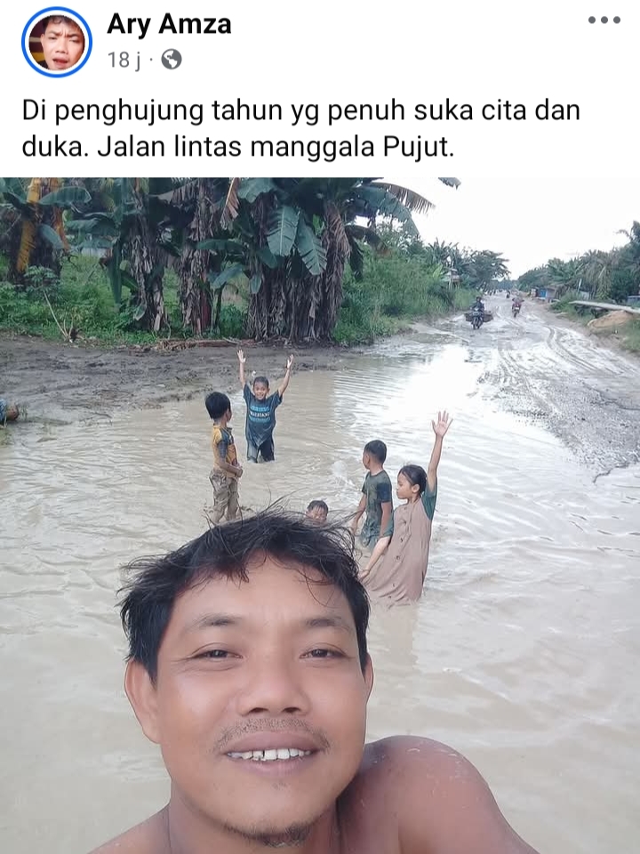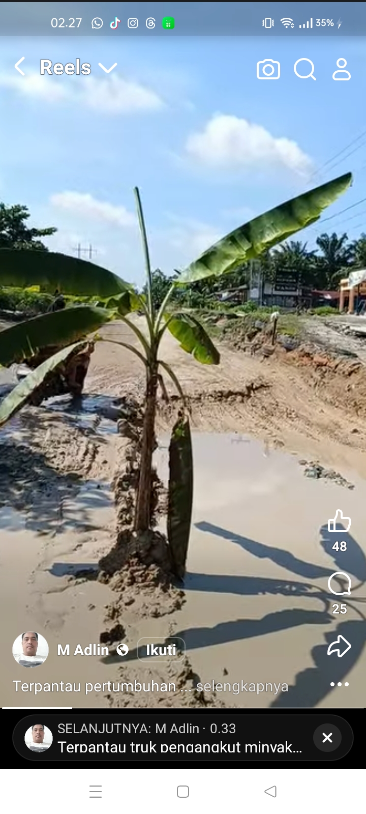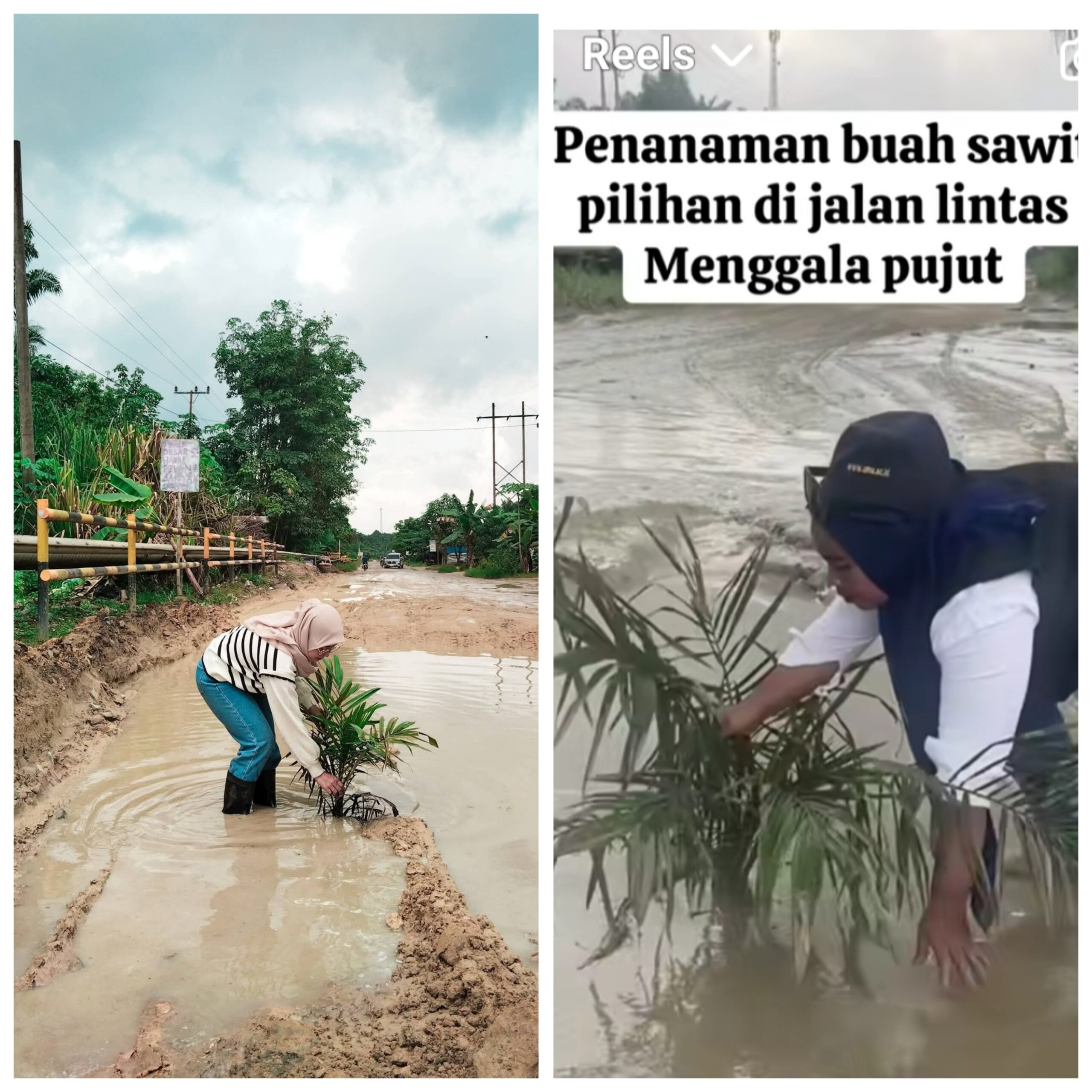 Akun Facebook atas nama Pajriah Nur, aksi penanaman sawit di jalan berlobang dan hal serupa juga dilakukan oleh akun Facebook atas nama M.Adlin dengan pohon pisangnya. Terpantau pohon ini cocok di tanam di sini,” ujarnya di video yang diunggah itu.