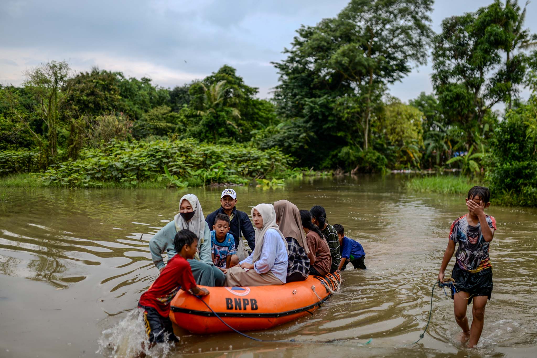 Pada foto, sejumlah warga menggunakan perahut karet untuk melewati banjir di Desa Cakung, Kabupaten Serang, Banten, Minggu (18/1/2026). ANTARA FOTO/ Muhammad Bagus Khoirunas