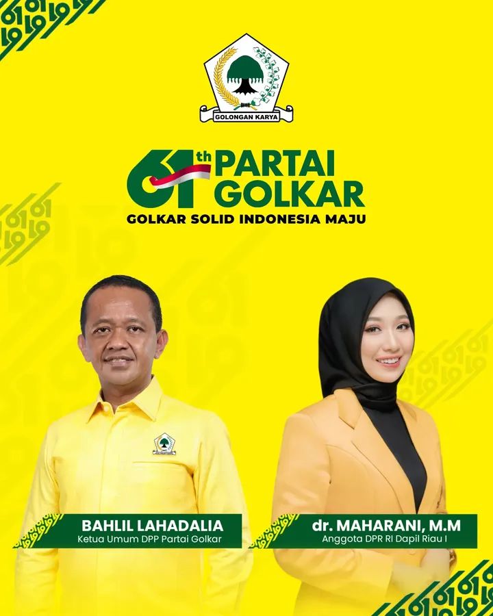 Pekanbaru, Infozone| Kader Partai Golkar Dr Maharani MM mengucapkan “Selamat Hari Ulang Tahun ke-61 Partai Golongan Karya (Golkar)”)”GOLKAR SOLID, INDONESIA MAJU”