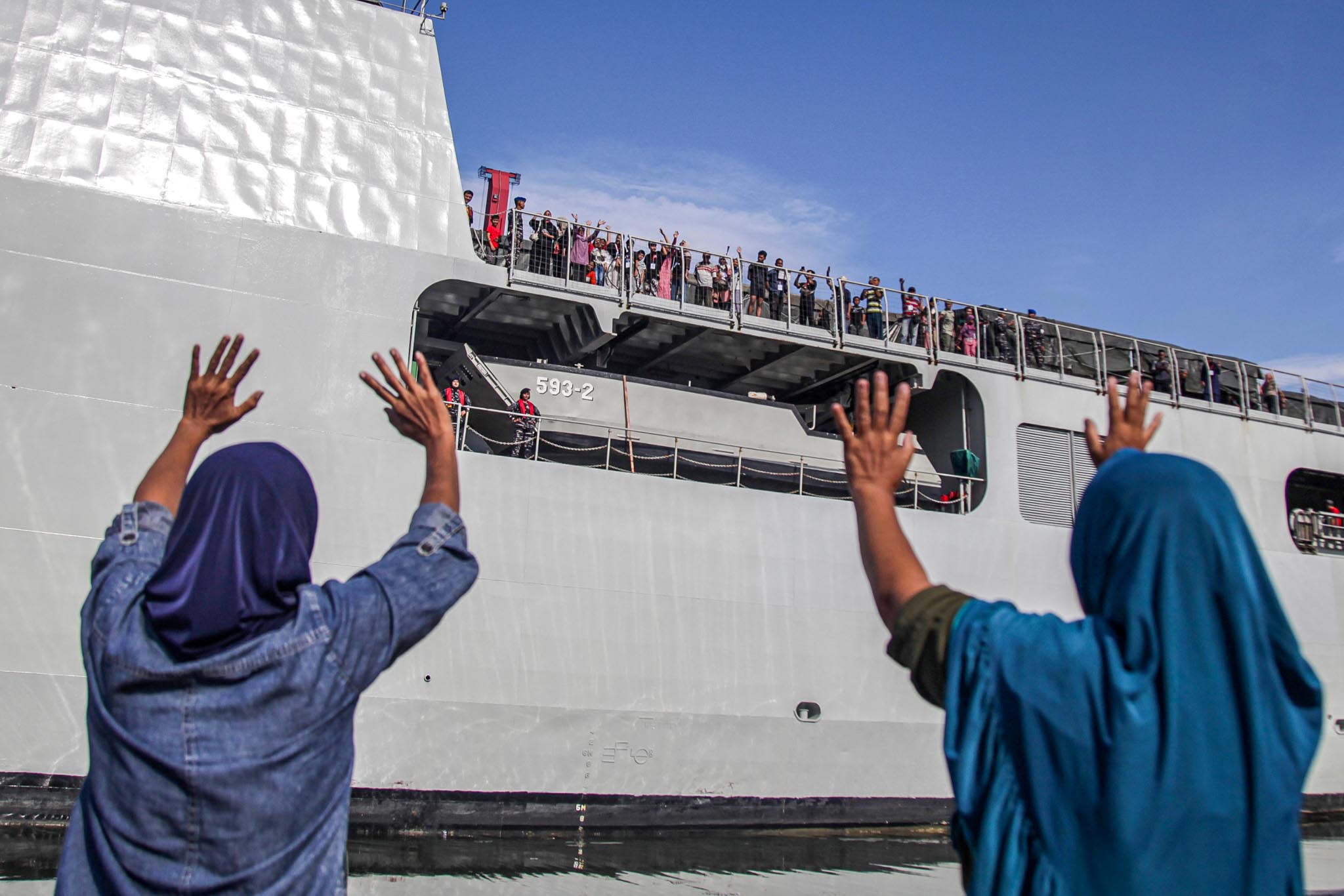 Pemudik melambaikan tangan dari atas KRI Banda Aceh-593 saat Mudik Gratis Bersama TNI AL di Dermaga Komando Lintas Laut Militer (Kolinlamil), Jakarta, Selasa (17/3/2026). TNI AL bekerja sama dengan Baznas menyelenggarakan mudik gratis naik kapal perang menuju Semarang dan Surabaya tersebut dengan memberangkatkan 1.447 orang yang bertujuan untuk meminimalisir terjadinya kemacetan dan kecelakaan lalu lintas saat mudik Lebaran. ANTARA FOTO/Darryl Ramadhan/nz
