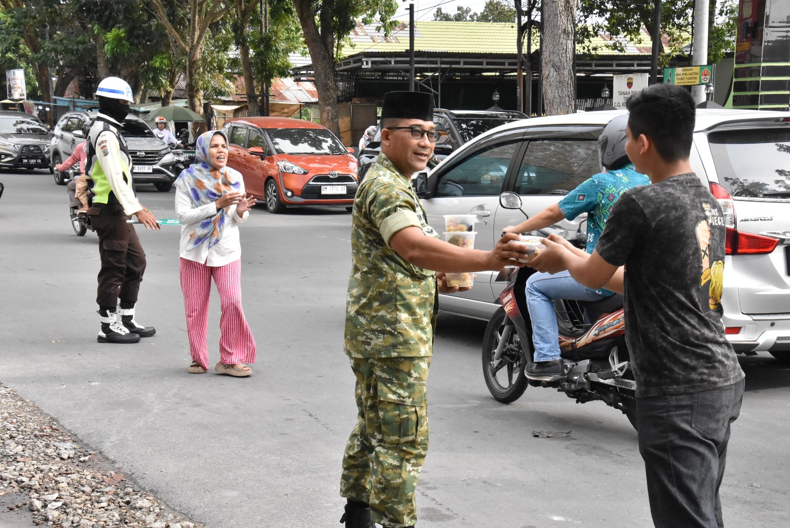 Pembagian takjil dilakukan oleh jajaran prajurit Korem 031/WB kepada pengendara roda dua, roda empat, serta warga yang melintas di kawasan Makorem menjelang waktu berbuka puasa.