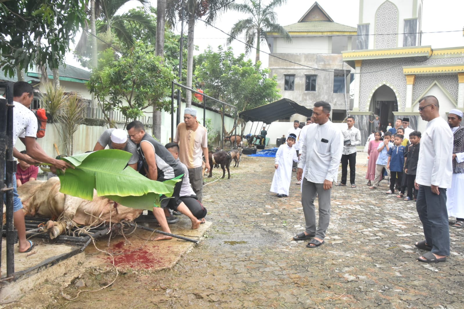 Usai pelaksanaan salat, acara dilanjutkan dengan pemotongan hewan kurban yang diselenggarakan di halaman masjid. Korem 031/WB tahun ini menyerahkan sejumlah 27 hewan kurban yang terdiri dari 15 ekor sapi dan 12 ekor kambing, yang dagingnya akan dibagikan kepada masyarakat yang membutuhkan, khususnya di sekitar wilayah masjid dan lingkungan Korem.