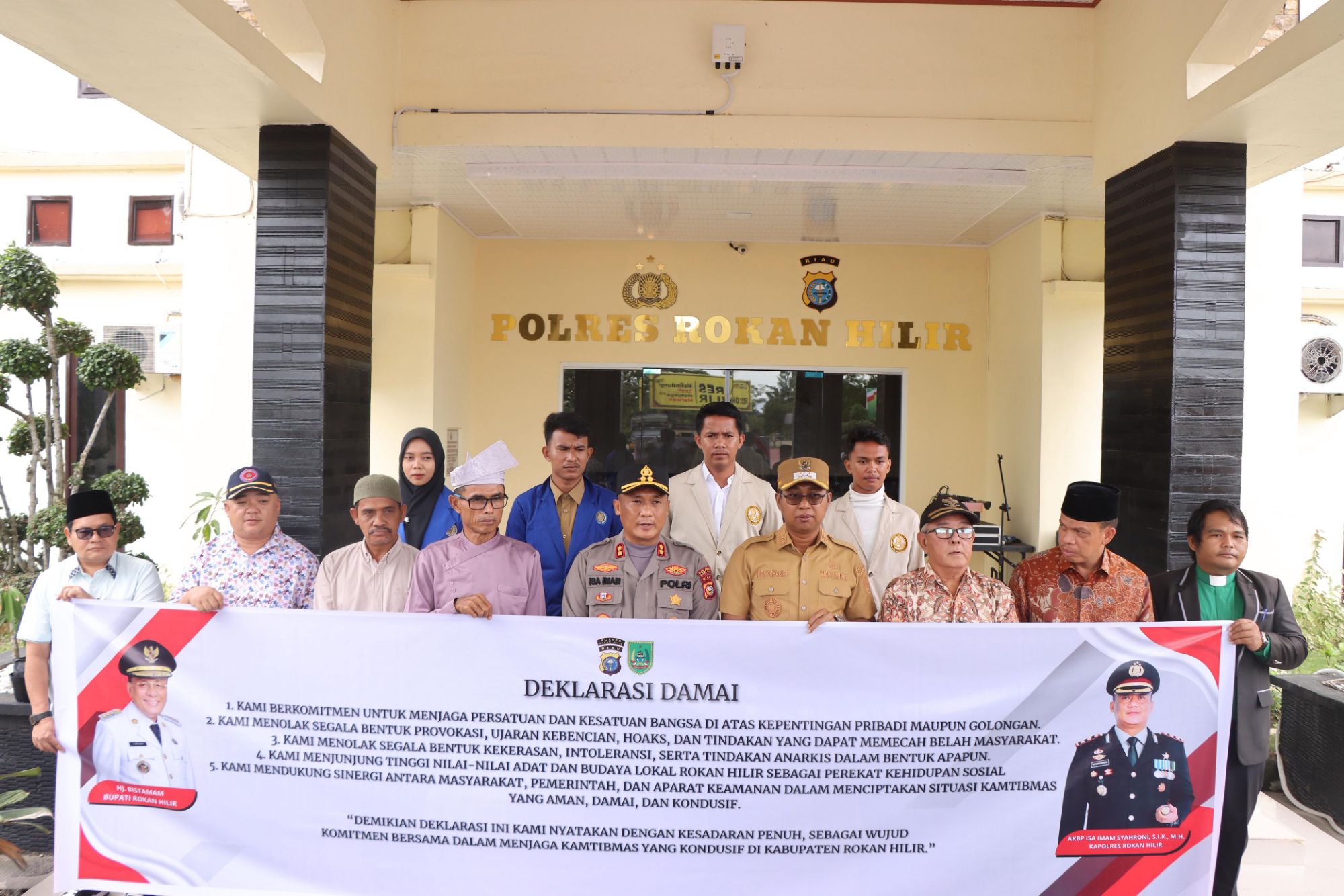 Rohil, Infozone | Dalam rangka menyikapi situasi dan kondisi terjadinya demonstrasi di berbagai daerah, Polres Rohil menginisiasi Deklarasi Damai dengan mengundang Bupati Rohil, LAMR Rohil, Ketua MUI, Tokoh Agama, Tokoh Masyarakat dan perwakilan Organisasi Mahasiswa Kabupaten Rohil, Dilaksanakan di Lobby Tathya Dharaka Polres Rokan Hilir. Selasa 1 September 2025. Pukul 12.45 WIB.