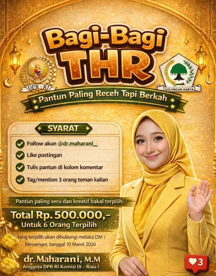 Jakarta, Infozone | Anggota Komisi IX DPR RI Fraksi Partai Golkar dari Dapil Riau 1 Dr Maharani MM menyatakan berbagi THR kepada masyarakat. Ini diunggahnya di jejaring media sosial Facebook. Sabtu 7 Maret 2026.