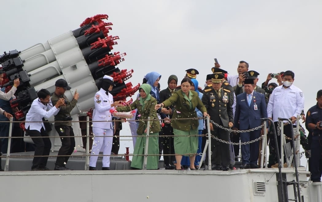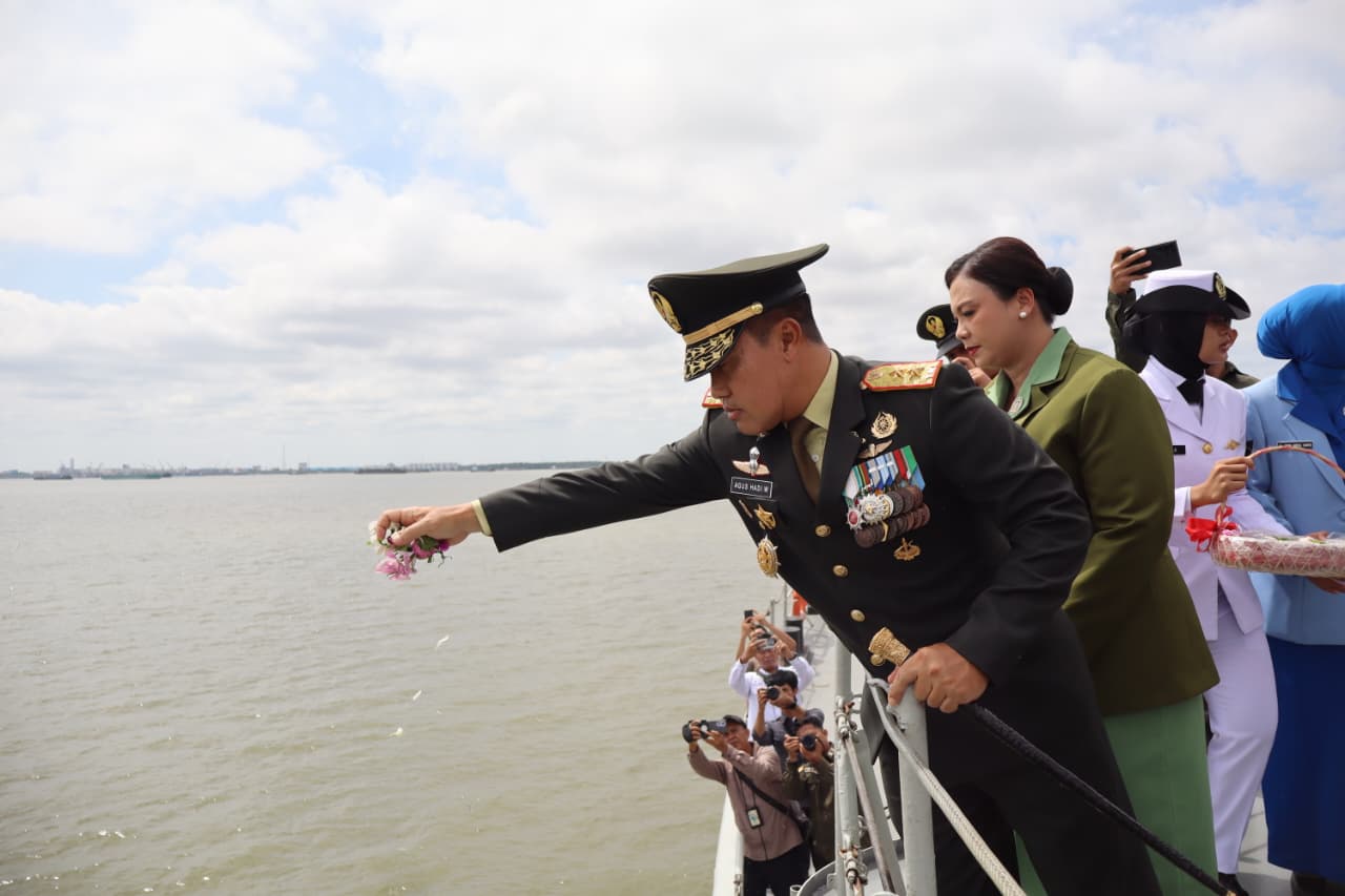 DUMAI, Infozone | Dalam rangka memperingati Hari Pahlawan Nasional tahun 2025, Pangdam XIX/Tuanku Tambusai, Mayjen TNI Dr. Agus Hadi Waluyo, S.A.P., M.M., CHRMP., memimpin kegiatan tabur bunga di atas KRI Sultan Thaha Sayfuddin wilayah Perairan Dumai, Kec. Sungai Sembilan-Kota Dumai Provinsi Riau pada Senin (10/11/2025).
