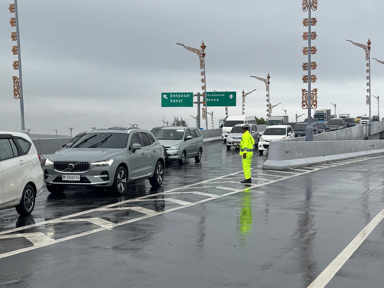 Antrean penganturan kendaraan roda empat dan roda dua yang melewati ruas tol benoa menuju bandara alami kepadatan dan petugas polisi lalu lintas Ditlantas Polda Bali bersiaga untuk melakukan pengaturan Kamis, (11/9/2025).