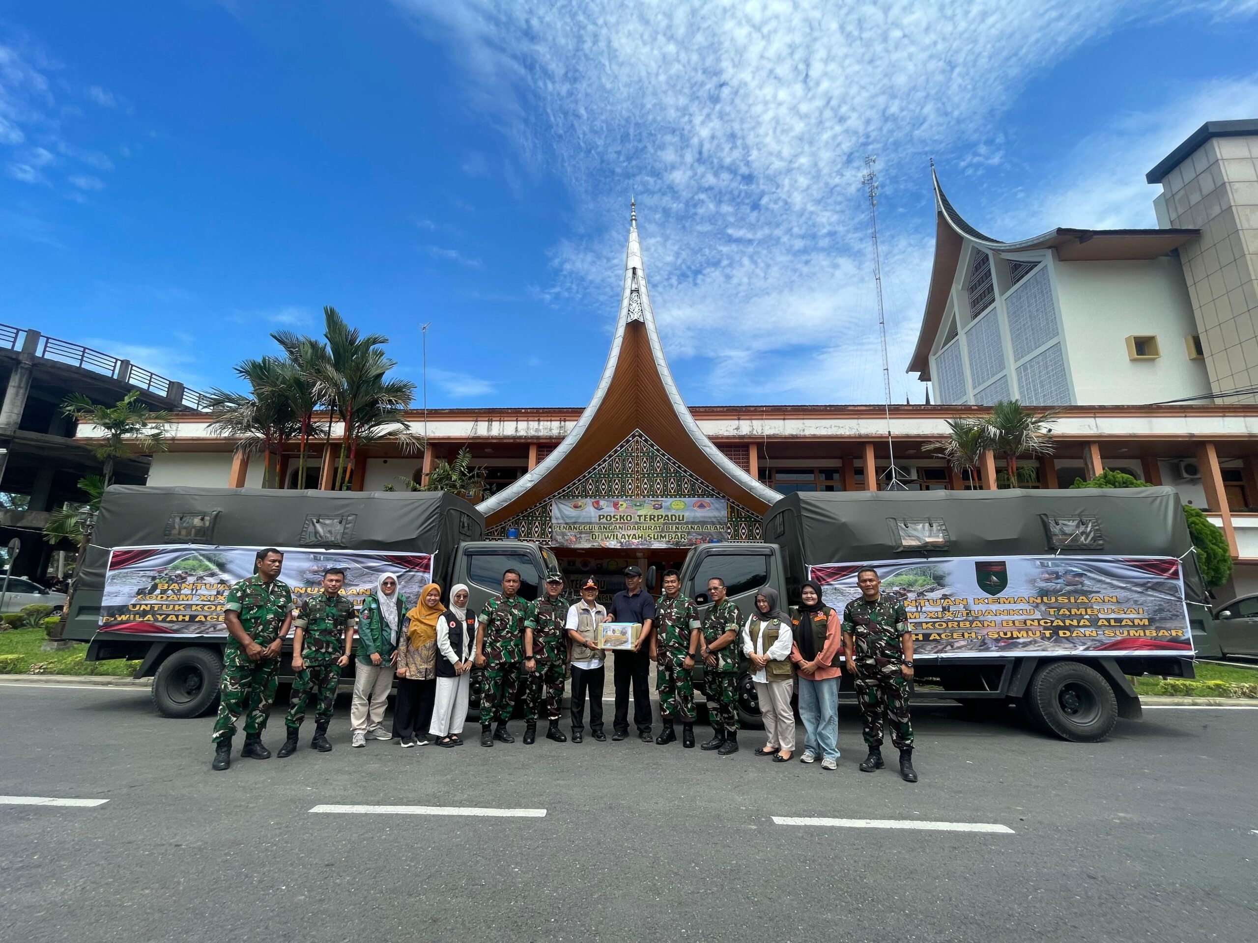 Pada pukul 11.45 WIB, bertempat di Posko Terpadu Kantor Gubernur Sumatera Barat, Jl. Jenderal Sudirman No. 47 Kota Padang, telah dilaksanakan penyerahan dan penerimaan bantuan sosial sebanyak 22 item logistik yang diangkut menggunakan 5 truk.