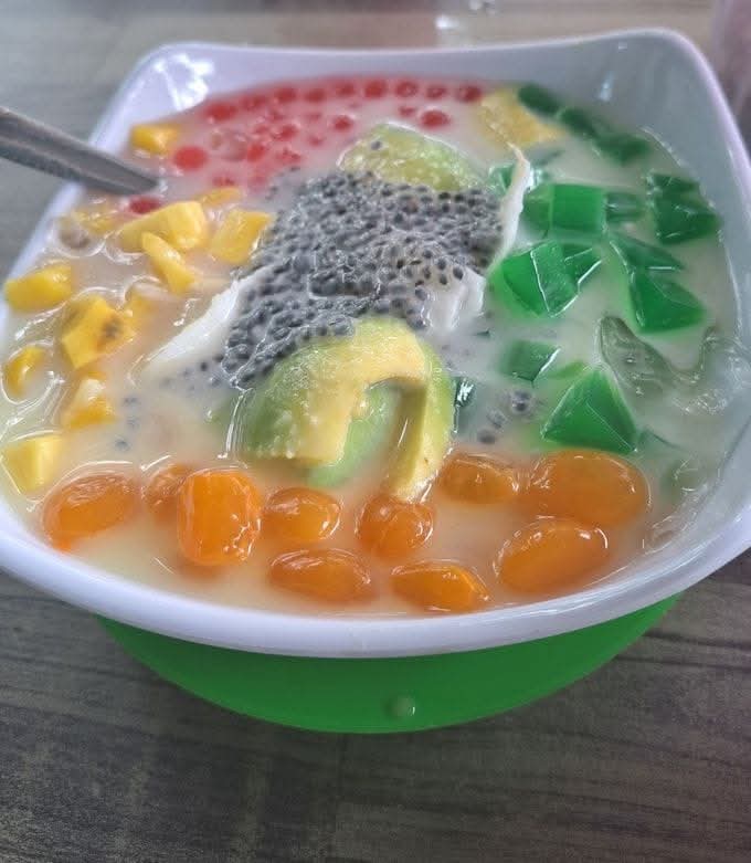1.Masukkan potongan alpukat, kelapa, melon,nangka dan biji selasih ke dalam wadah.