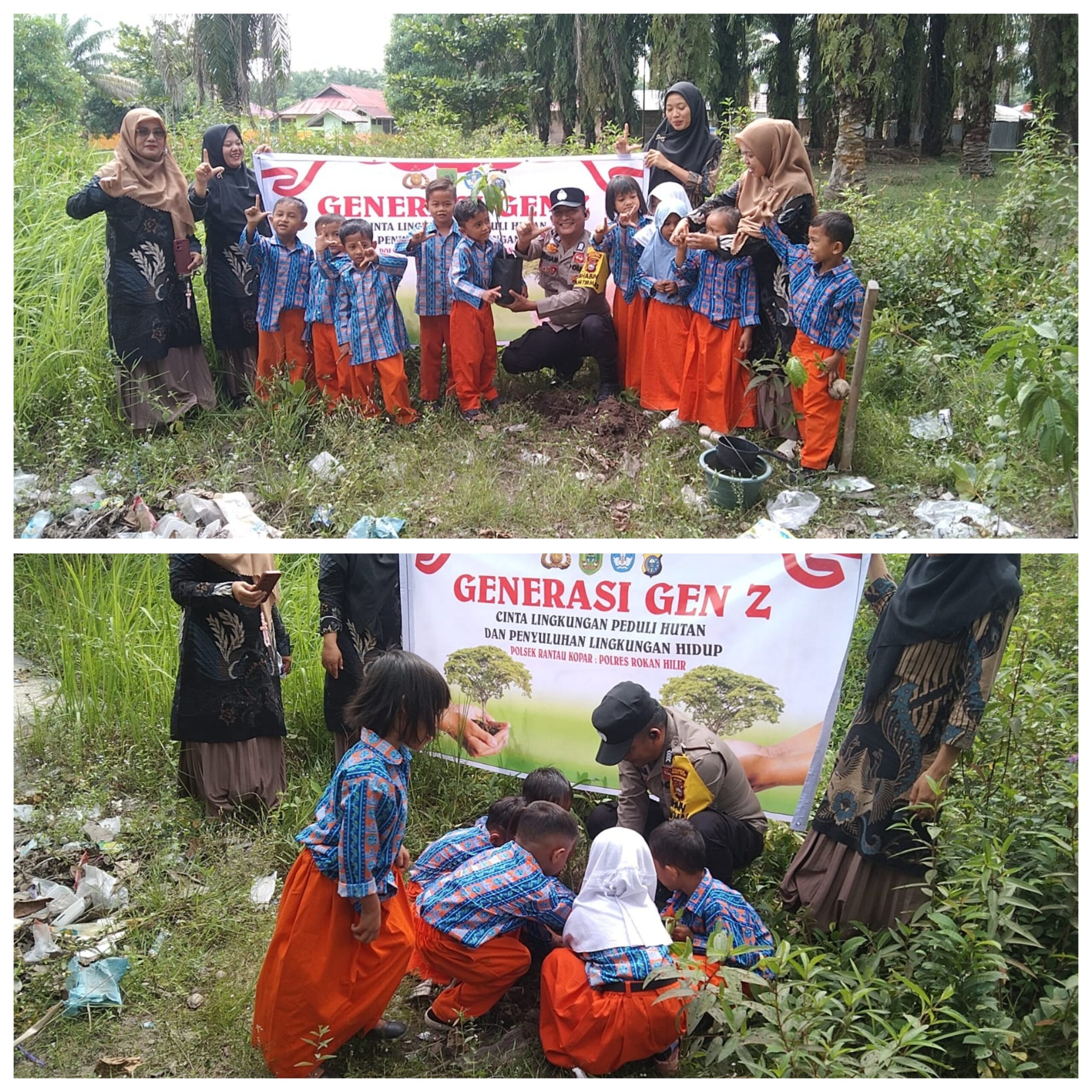 Bhabinkamtibmas Kepenghuluan Bagan Cempedak Bripka Surian menyampaikan edukasi ramah lingkungan, pengelolaan sampah dan penghijauan kembali dengan menanami bibit pohon bersama.