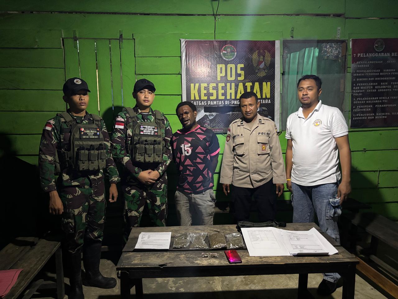 MOSSO, Infozone| Personil Pos Mosso, Satgas Pamtas RI-PNG Statis Yonif 643/Wns kembali berhasil menggagalkan peredaran narkotika jenis Ganja bertempat di Kp. Mosso, Distrik Muara Tami, Kota Jayapura, Minggu (23/11/2025).