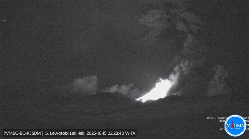 NTT, Infozone| Telah terjadi erupsi G. Lewotobi Laki-laki, Nusa Tenggara Timur pada tanggal 15 Oktober 2025 pukul 01:35 WITA dengan tinggi kolom abu teramati ± 10.000 m di atas puncak (± 11.584 m di atas permukaan laut). Kolom abu teramati berwarna kelabu dengan intensitas tebal condong ke arah barat daya, barat, dan barat laut. Erupsi ini terekam di seismogram dengan amplitudo maksimum 47.3 mm dan durasi ± 9 menit 6 detik.